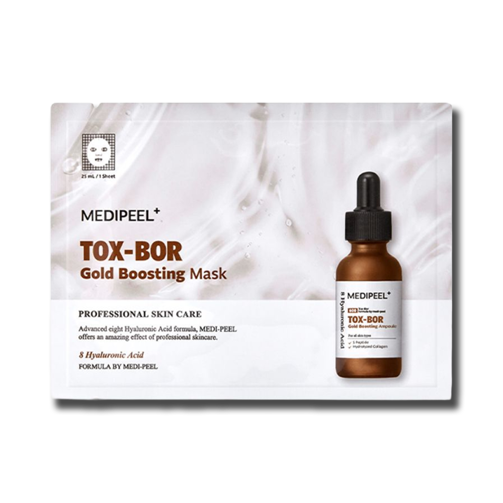 Medipeel Tox-Bor Gold Boosting Mask — преміальна тканинна маска з 24-каратним золотом, бором та пептидами, створена для інтенсивного ліфтингу, глибокої гідратації та відновлення природного сяйва. Завдяки синергії мікрочастинок золота, ферментованих комплексів і висококонцентрованих пептидів, маска помітно підвищує тонус шкіри, розгладжує дрібні зморшки та повертає обличчю свіжий, відпочилий вигляд.